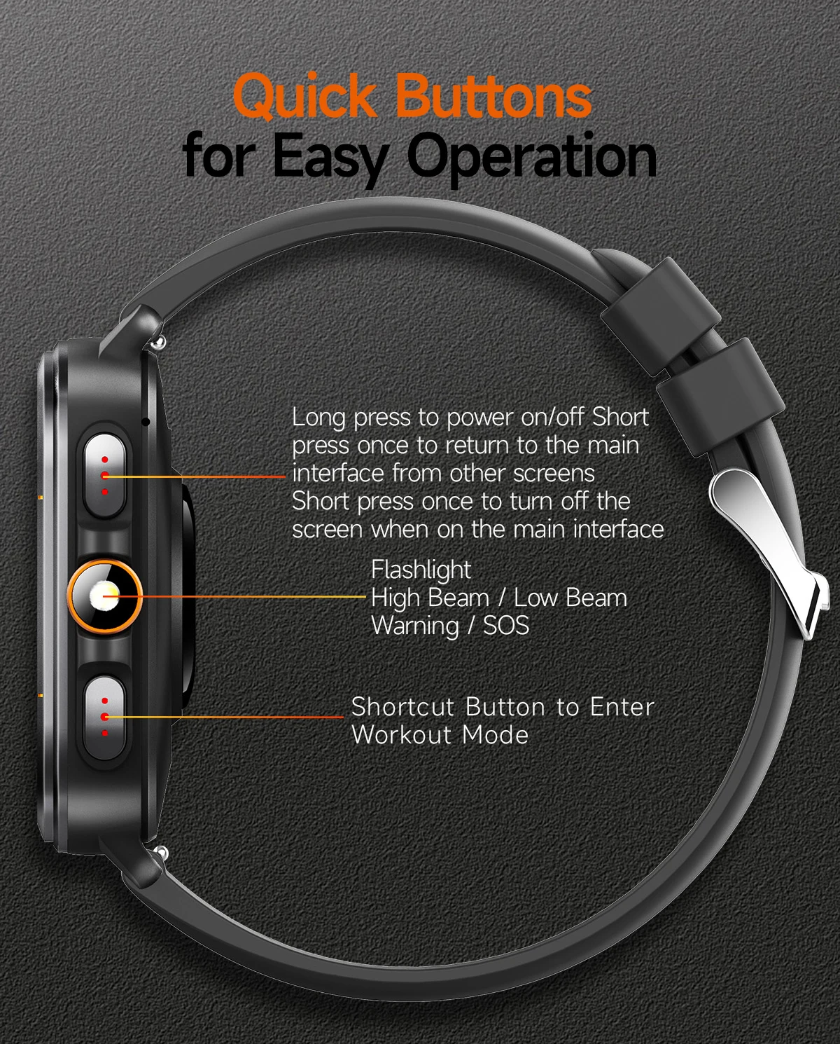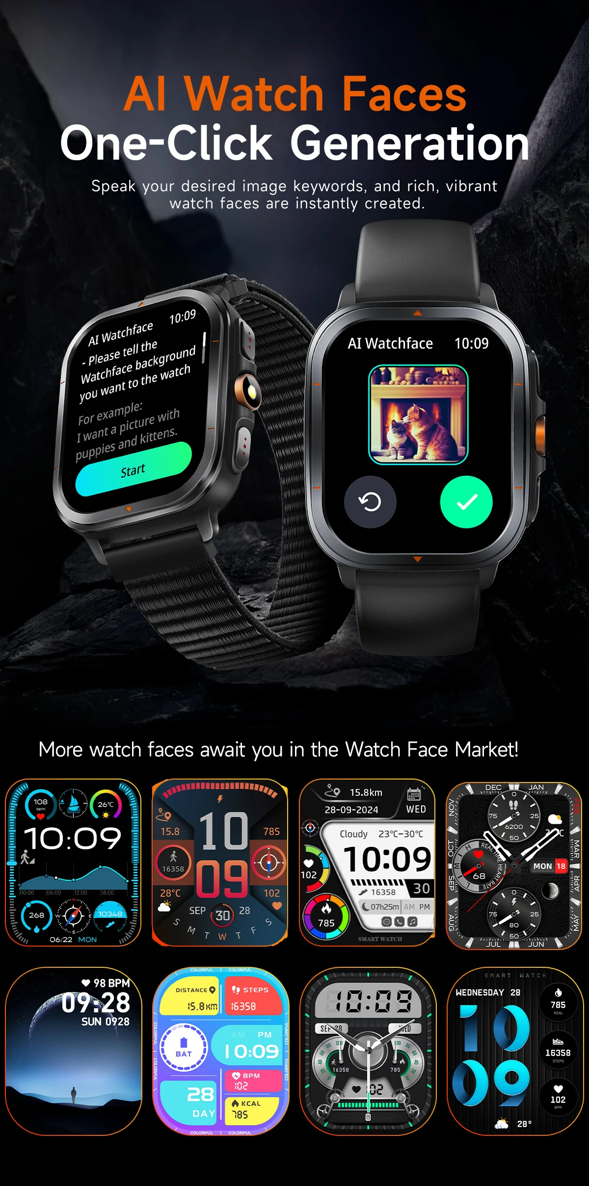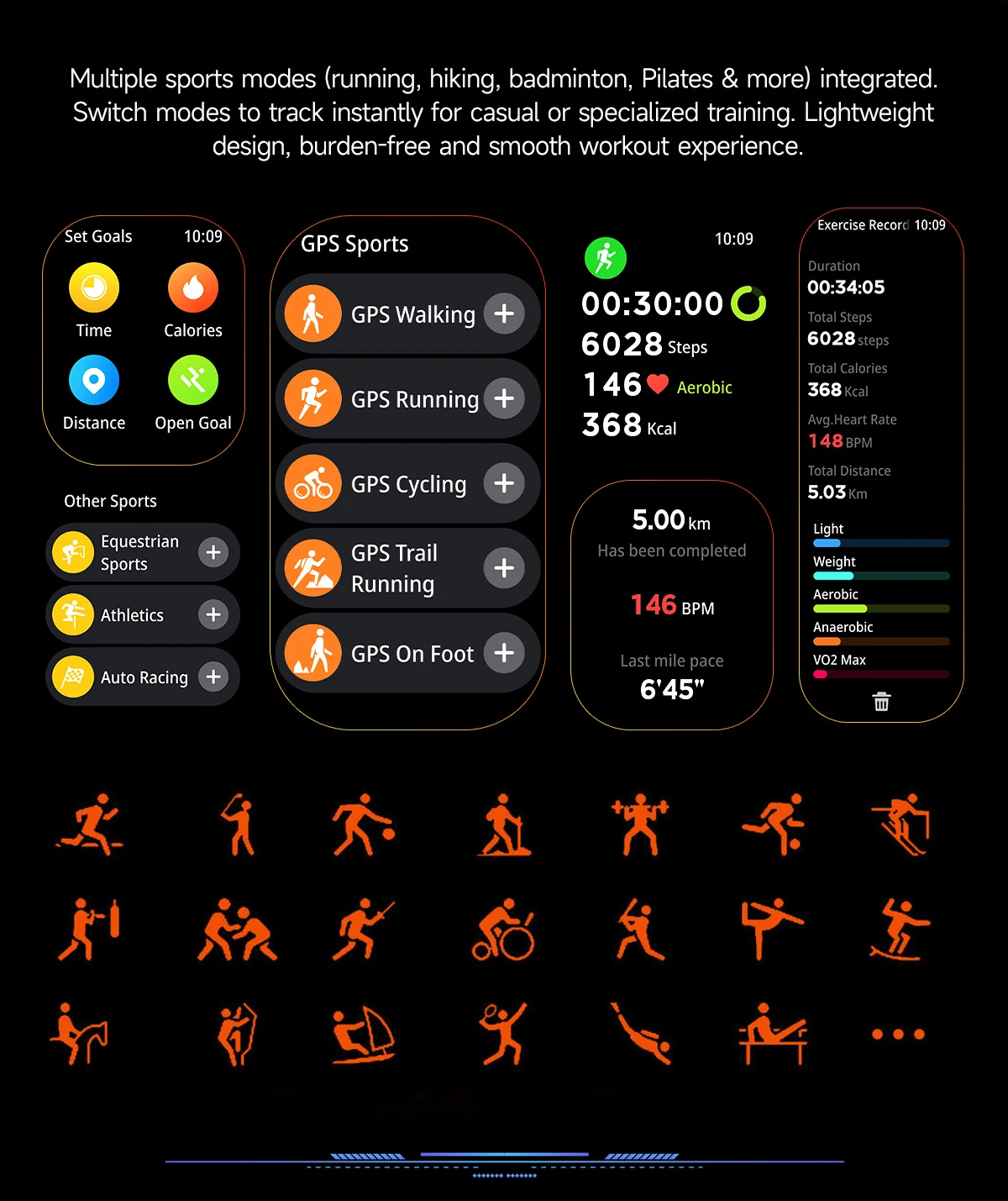 Main features: GPS positioning, altimeter, barometer, compass, AI watch face, AI Q&A, high-powered flashlight (4 modes), Go More algorithm, accurate sleep monitoring, IP68 deep dust and water resistance, 120+ sports modes, heart rate monitoring, stress monitoring, true blood oxygen saturation, blood pressure monitoring, and always-on display clock.